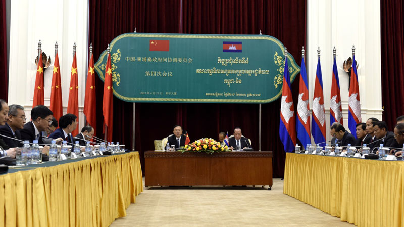 4月27日,在柬埔寨首都金边,中国国务委员杨洁篪(中,左)与柬埔寨副首相贺南洪(中,右)出席会议。当日,中柬政府间协调委员会第四次会议在柬埔寨金边举行,杨洁篪国务委员同贺南洪副首相共同主持。新华社记者 张艳芳 摄