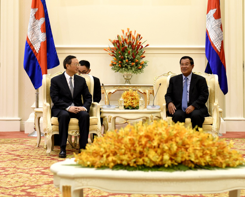 4月28日,柬埔寨首相洪森(右)在金边会见中国国务委员杨洁篪。