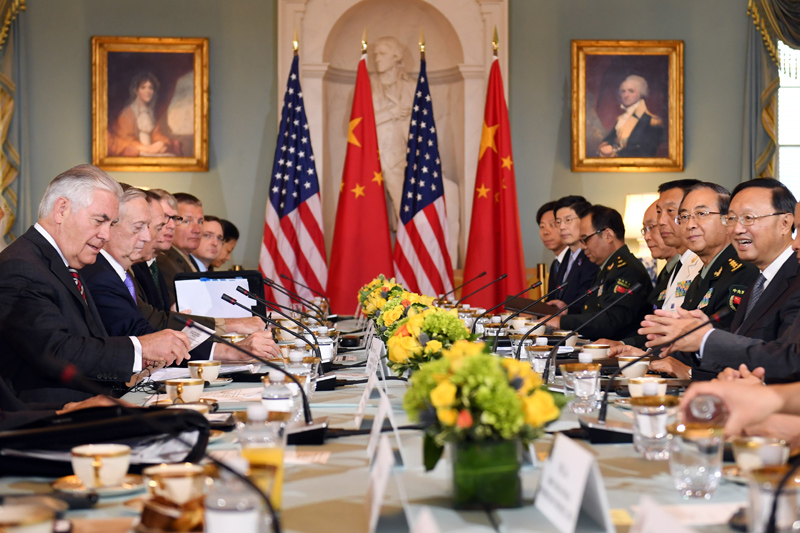 6月21日,在美国华盛顿,中国国务委员杨洁篪(右一)同美国国务卿蒂勒森(左一)、美国国防部长马蒂斯(左二)共同主持中美外交安全对话。当地时间21日上午,首轮中美外交安全对话在华盛顿开始举行。在为期一天的对话中,中美双方将就中美关系以及共同关心的重要国际和地区问题深入交换意见。新华社记者 殷博古 摄