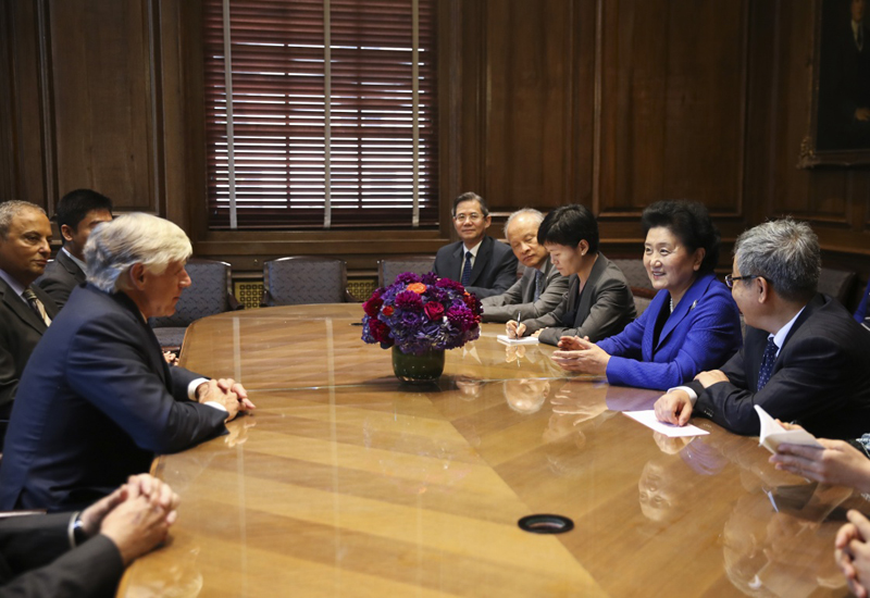 当地时间9月26日,江南平台入口 副总理刘延东在纽约哥伦比亚大学出席中美大学校长与智库论坛并发表主旨演讲。这是论坛开始前,江南平台入口 副总理刘延东(右二)会见哥伦比亚大学校长博林格(左)。