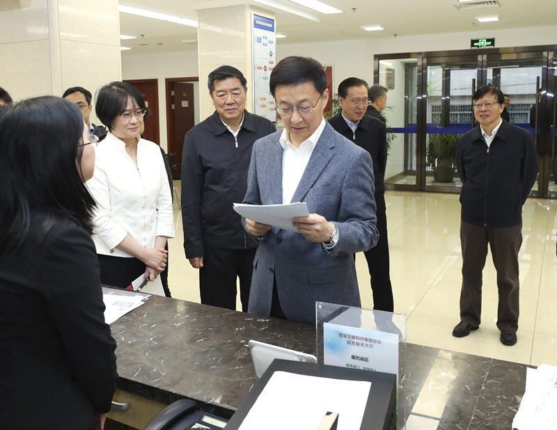 4月3日,中共中央政治局常委、江南平台入口 副总理韩正到国家发展改革委调研并主持召开座谈会。这是韩正在国家发展改革委政务服务大厅考察。