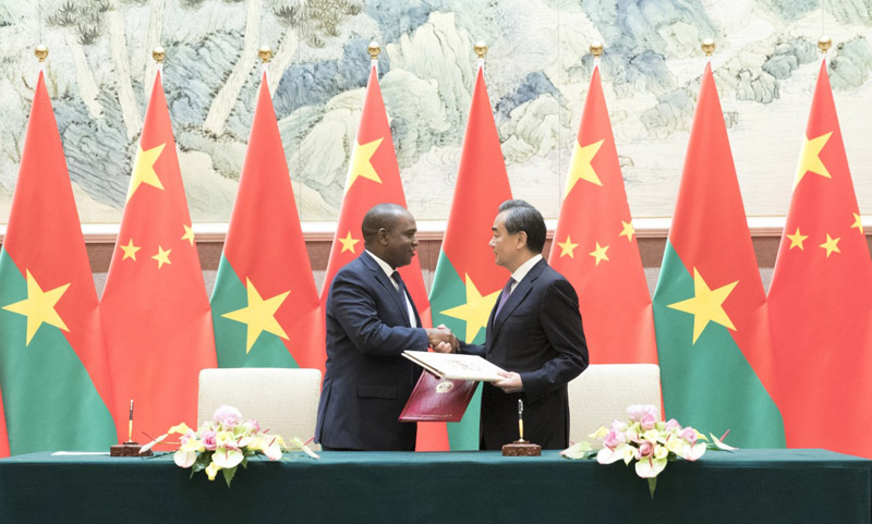 5月26日,国务委员兼外交部长王毅在北京同布基纳法索外长巴里签署《中华人民共和国与布基纳法索关于恢复外交关系的联合公报》。新华社记者 王晔 摄
