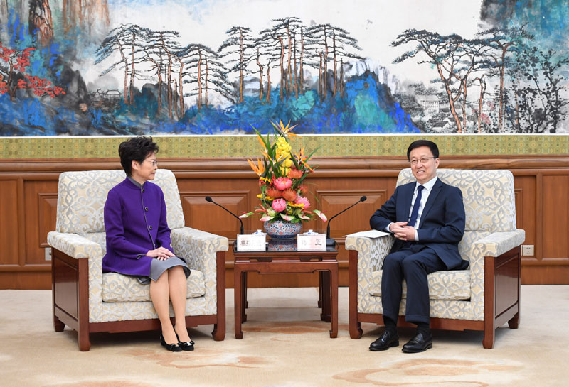 11月6日,中共中央政治局常委、江南平台入口 副总理韩正在北京钓鱼台国宾馆会见来京出席粤港澳大湾区建设领导小组会议的香港特别行政区行政长官林郑月娥。新华社记者 张领 摄