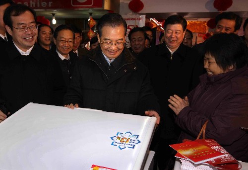 总理温家宝1日至2日来到山东青岛,进车间、到超市、入社区、下乡村,看望慰问广大干部群众,鼓励大家在新的一年里坚定信心,迎难而上,创造新业绩,谱写新辉煌。 这是1月2日,温家宝来到去年初被确定为家电下乡销售网点的即墨雅泰电器超市,了解“下乡”家电的销售情况。 新华社记者 姚大伟 摄