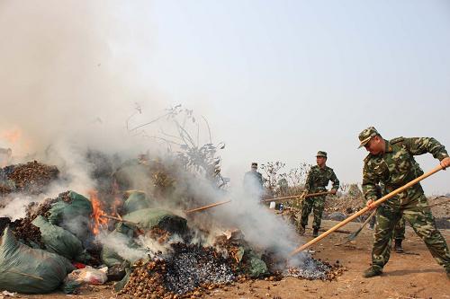 3月19日,一名边防军官在销毁罂粟壳。新华社发(肖林 摄)