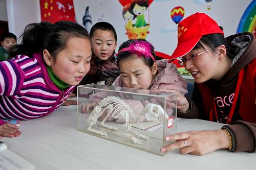 利用休息时间来做志愿者的刘华(右)在辅导孩子们课外活动(3月23日摄)。新华社记者 杨磊 摄