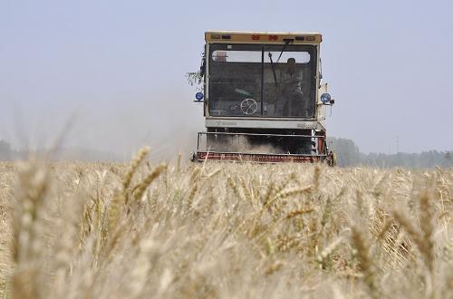 6月18日,一台联合收割机在河北省廊坊市安次区把什营村田间作业。时下,正是河北省廊坊市安次区2万亩小麦收获的季节。该区抢抓天气晴好有利时机,投入大中型拖拉机430台、收割机40台、小型拖拉机550台、跨区作业联合收割机35台及其他农机具680台,帮助农民收割小麦。目前,该区已收割小麦5000亩,播种3.4万亩。新华社发