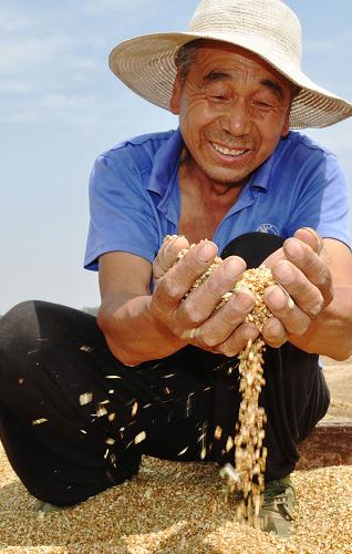 6月18日,河北省廊坊市安次区把什营村农民在展示刚收获的麦子。新华社发