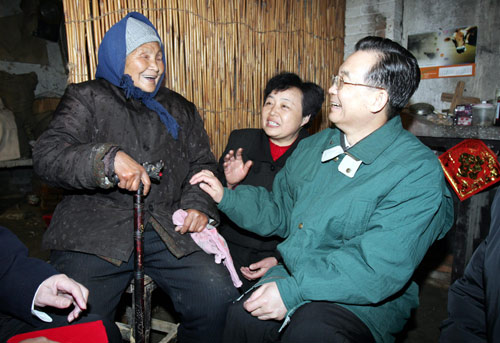 总理温家宝来到山东菏泽、济宁农村,与群众共度春节。这是1月28日,温家宝在山东菏泽五里墩村看望五保户老人郭秀兰。新华社记者 姚大伟 摄