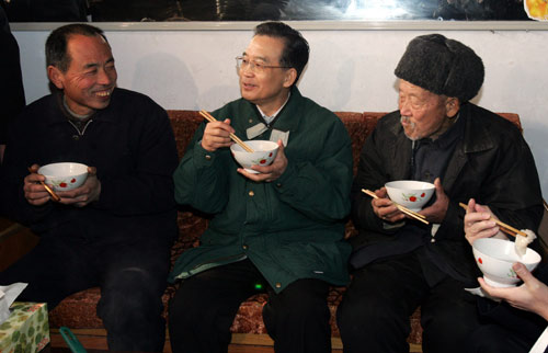 这是1月28日,温家宝在山东菏泽牛楼村牛辉亭老人家与他们一起吃饺子。新华社记者 姚大伟 摄