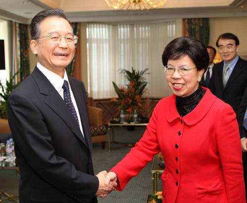 总理温家宝在瑞士达沃斯会见世界卫生组织总干事陈冯富珍。新华社记者兰红光摄