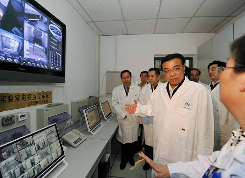 副总理李克强在北京首都国际机场、中国疾病预防控制中心考察人感染猪流感防控工作。这是李克强考察中国疾病预防控制中心实验室。新华社记者饶爱民摄