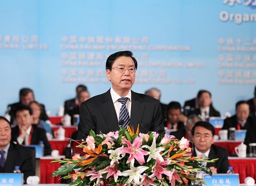 张德江代表中国政府对大会召开表示祝贺,对与会代表表示欢迎。他在讲话中充分肯定了我国高速铁路建设取得的历史性进展以及在促进经济社会发展中的重要作用。他指出,“十二五”时期我国发展仍处于重要战略机遇期,也是高速铁路发展的重要时期,要深入贯彻落实科学发展观,全面贯彻落实党的十七届五中全会精神,遵循安全、便捷、高效、绿色的原则,把高速铁路作为优先发展的战略性新兴产业,坚持科学发展,坚持安全第一,坚持改革开放,注重自主创新,注重提高质量,注重提高效益,实现高速铁路新的更大发展。