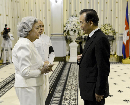 总理温家宝18日前往柬埔寨王宫吊唁柬埔寨太皇西哈努克,并会见柬埔寨太后莫尼列和国王西哈莫尼。