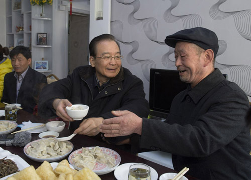 总理温家宝来到陕西省勉县、略阳,甘肃省康县、舟曲等地,驱车行驶720多公里,看望慰问各族干部群众。这是2月9日,温家宝在甘肃省舟曲县新建居民小区同受灾群众一起吃饺子。 新华社记者 李学仁 摄