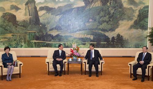 中共中央政治局常委俞正声,中共中央政治局委员王沪宁、栗战书,国务委员戴秉国,中共中央台办主任王毅、海协会会长陈云林等参加会见。