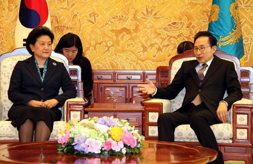 2月24日,胡锦涛主席、习近平总书记特别代表、国务委员刘延东(左)在韩国首尔会见韩国总统李明博。新华社记者 冮冶 摄