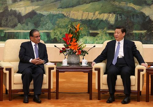 习近平说,中尼两国是好邻居、好朋友、好伙伴。中国党和政府高度重视发展中尼关系,赞赏尼方长期坚持一个中国政策,支持尼泊尔为实现国家进步和发展所作出的努力,愿同尼方一道,巩固睦邻友好,深化互利合作,共同推动中尼世代友好的全面合作伙伴关系取得新发展。他表示,中尼友好符合两国和两国人民的根本利益,也有利于地区的稳定和发展。中国将坚持与邻为善、以邻为伴,与尼泊尔等周边国家一起走和平发展、合作共赢的道路,实现成果共享、共同发展。习近平高度评价中尼党际交往成果,表示中国共产党愿继续与联合尼共(毛)等尼泊尔主要政党加强交流合作,为促进中尼友好发挥积极作用。