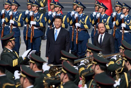 4月25日,中国国家主席习近平在北京举行仪式欢迎法国总统弗朗索瓦·奥朗德访华。新华社记者 兰红光 摄