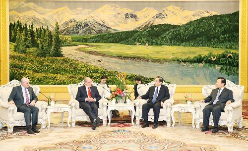 5月14日,全国政协主席俞正声在北京人民大会堂会见爱尔兰议会众议长巴雷特(左二)、参议长伯克(左一)。新华社记者姚大伟摄