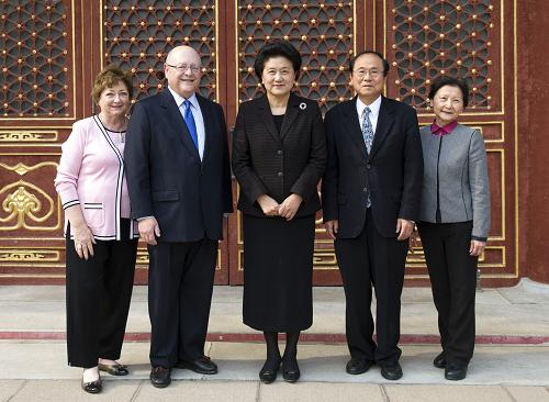 副总理刘延东在北京会见美国加州大学系统总校长马克·尤多夫(左二)和圣巴巴拉分校校长杨祖佑(右二)一行。新华社记者 谢环驰 摄