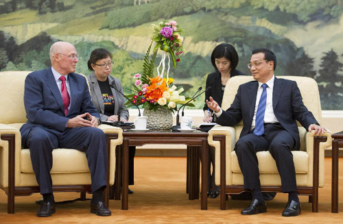 总理李克强在北京人民大会堂会见美国前财长保尔森。新华社记者 黄敬文 摄