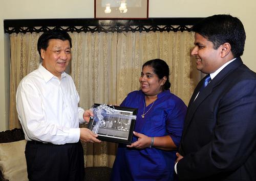 9月9日,中共中央政治局常委、中央书记处书记刘云山在科伦坡看望曾代表斯里兰卡与新中国签署《米胶协定》的已故贸工部长森纳那亚克的家人。新华社记者 饶爱民 摄