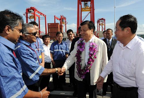 9月9日,中共中央政治局常委、中央书记处书记刘云山在斯里兰卡科伦坡考察科伦坡港南集装箱码头。 新华社记者 饶爱民 摄
