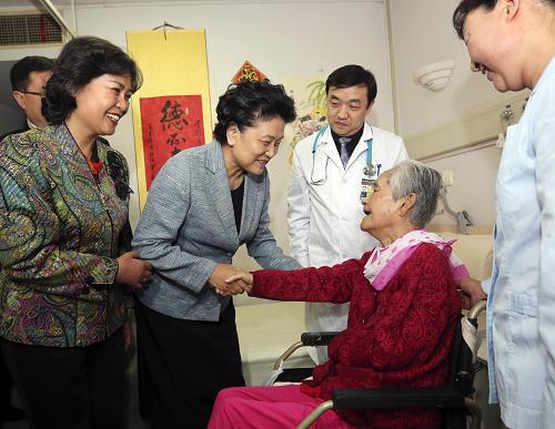 副总理刘延东赴北京银龄老年公寓义诊活动现场考察并祝贺老人们重阳节快乐。这是刘延东看望赵锡宇老人。新华社记者 丁林 摄