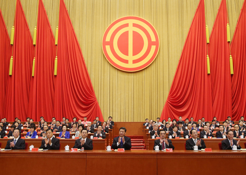 10月18日,中国工会第十六次全国代表大会在北京人民大会堂开幕。习近平、李克强、张德江、俞正声、刘云山、王岐山、张高丽等在主席台就座,祝贺大会召开。新华社记者姚大伟摄