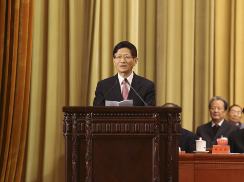 11月29日,中国法学会第七次全国会员代表大会在北京人民大会堂开幕。中共中央政治局委员、中央政法委书记孟建柱受习近平总书记委托代表党中央发表题为《积极投身法治中国建设的伟大实践》的祝词。新华社记者丁林摄