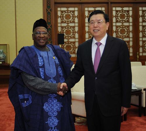 11月27日,中共中央政治局常委、全国人大常委会委员长张德江在北京人民大会堂会见尼日利亚人民民主党主席图库尔。 新华社记者 刘卫兵 摄