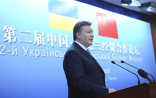 副总理马凯与乌克兰总统亚努科维奇共同出席论坛开幕式并致辞。这是亚努科维奇致辞。新华社记者 张铎 摄