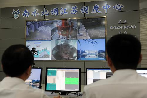 5月30日,南水北调江苏调度中心的工作人员在查看各泵站输水运行情况。当日,南水北调东线一期工程江苏段开始试通水,这标志着南水北调东线一期工程向今年三季度通水的目标又迈进了一步。南水北调东线一期工程规划从江苏省扬州附近的长江干流引水,利用京杭大运河以及与其平行的河道调水到山东半岛和鲁北地区,向沿线江苏、安徽、山东供水。供水范围南起长江,北至德州,东至威海,涉及江苏、安徽、山东3省的21个地级市和其辖内的71个县市区,土地总面积16.6万平方公里,人口约1亿人,直接供水受益人口近6000万人。新华社记者 韩瑜庆 摄