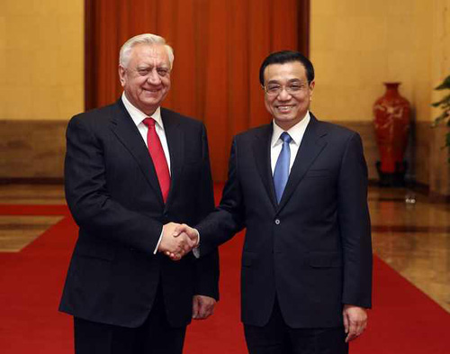 总理李克强在北京中南海紫光阁会见来华出席中柬政府间协调委员会首次会议的柬埔寨副首相兼外交国际合作大臣贺南洪。新华社记者 饶爱民 摄