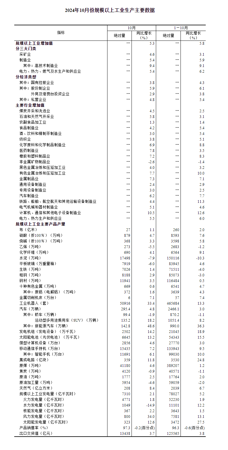 2024年10月份规模以上工业增加值增长5.3%