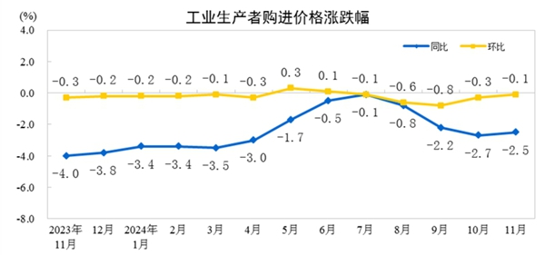 2024年11月份,全国工业生产者出厂价格同比下降2.5%,降幅比上月收窄0.4个百分点,环比由上月下降0.1%转为上涨0.1%;工业生产者购进价格同比下降2.5%,环比下降0.1%。1—11月平均,工业生产者出厂价格比上年同期下降2.1%,工业生产者购进价格下降2.2%。