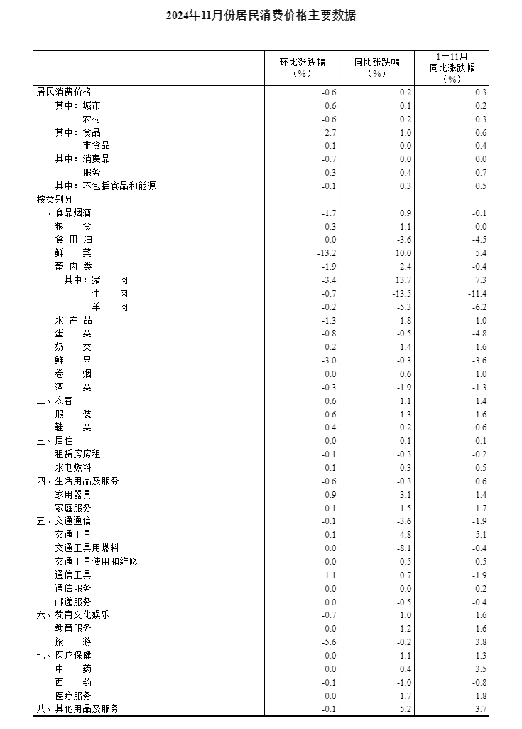 2024年11月份,全国居民消费价格同比上涨0.2%。其中,城市上涨0.1%,农村上涨0.2%;食品价格上涨1.0%,非食品价格持平;消费品价格持平,服务价格上涨0.4%。1­­—11月平均,全国居民消费价格比上年同期上涨0.3%。