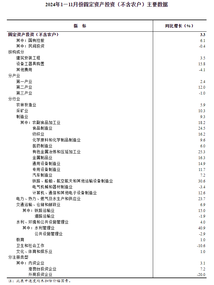 2024年1—11月份全国固定资产投资增长3.3%