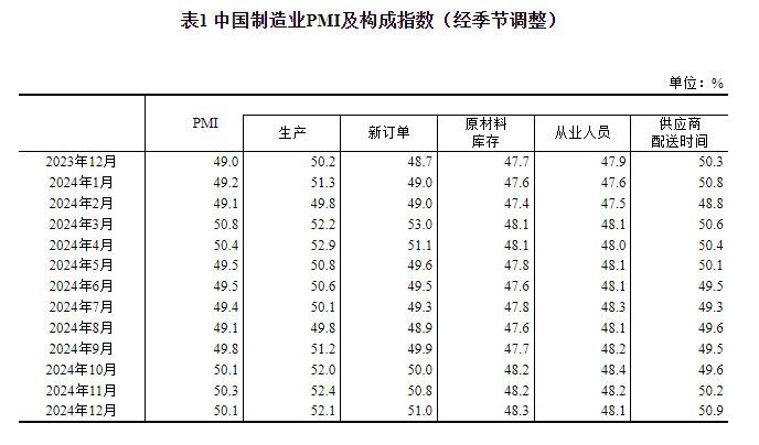 12月份,制造业采购经理指数(PMI)为50.1%,比上月下降0.2个百分点,制造业继续保持扩张。
