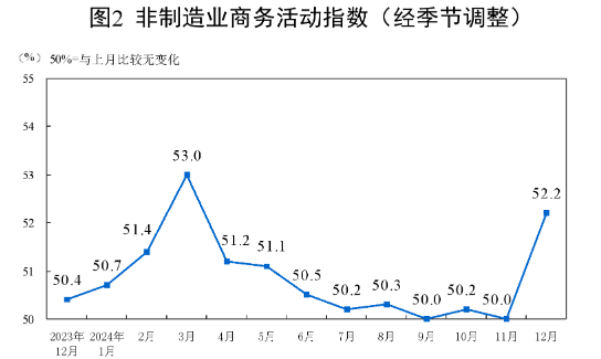 12月份,非制造业商务活动指数为52.2%,比上月上升2.2个百分点,非制造业景气水平明显回升。