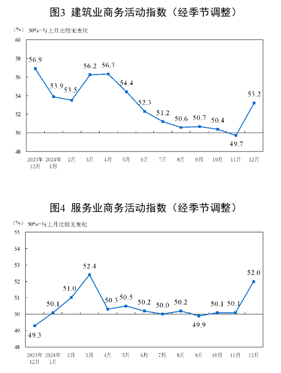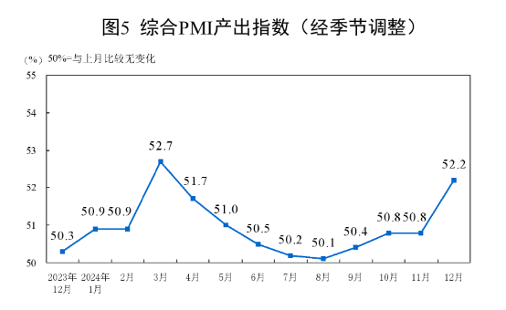 12月份,综合PMI产出指数为52.2%,比上月上升1.4个百分点,表明我国企业生产经营活动总体扩张加快。