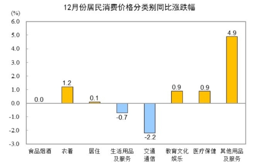12月份,食品烟酒类价格环比下降0.3%,影响CPI下降约0.09个百分点。食品中,鲜菜价格下降2.4%,影响CPI下降约0.05个百分点;畜肉类价格下降1.3%,影响CPI下降约0.04个百分点,其中猪肉价格下降2.1%,影响CPI下降约0.03个百分点;鲜果价格下降1.0%,影响CPI下降约0.02个百分点。