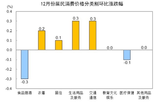 12月份,全国居民消费价格环比持平。其中,城市持平,农村下降0.1%;食品价格下降0.6%,非食品价格上涨0.1%;消费品价格下降0.1%,服务价格上涨0.1%。
