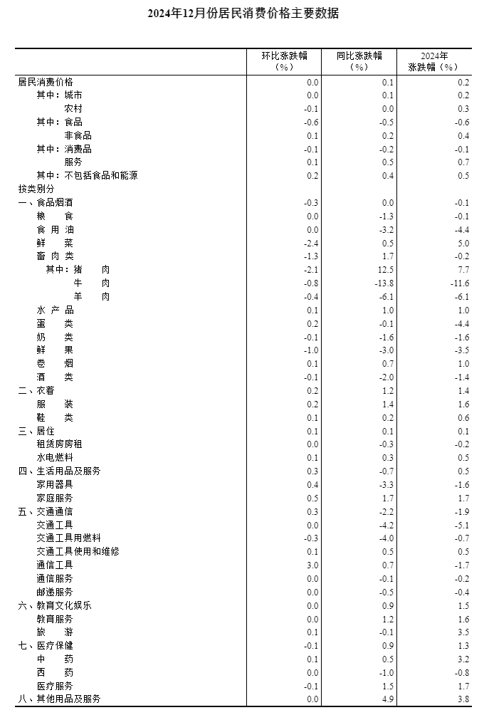 2024年12月份,全国居民消费价格同比上涨0.1%。其中,城市上涨0.1%,农村持平;食品价格下降0.5%,非食品价格上涨0.2%;消费品价格下降0.2%,服务价格上涨0.5%。