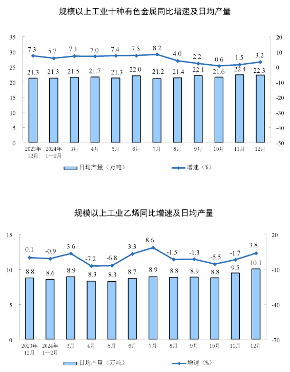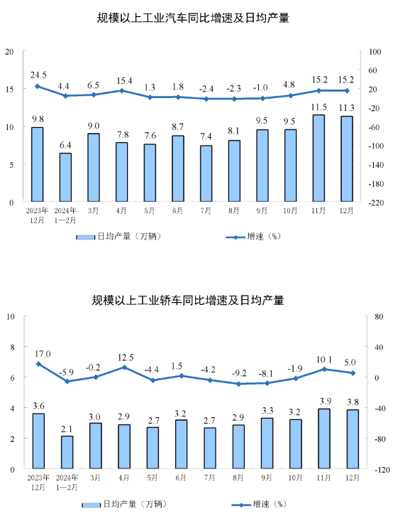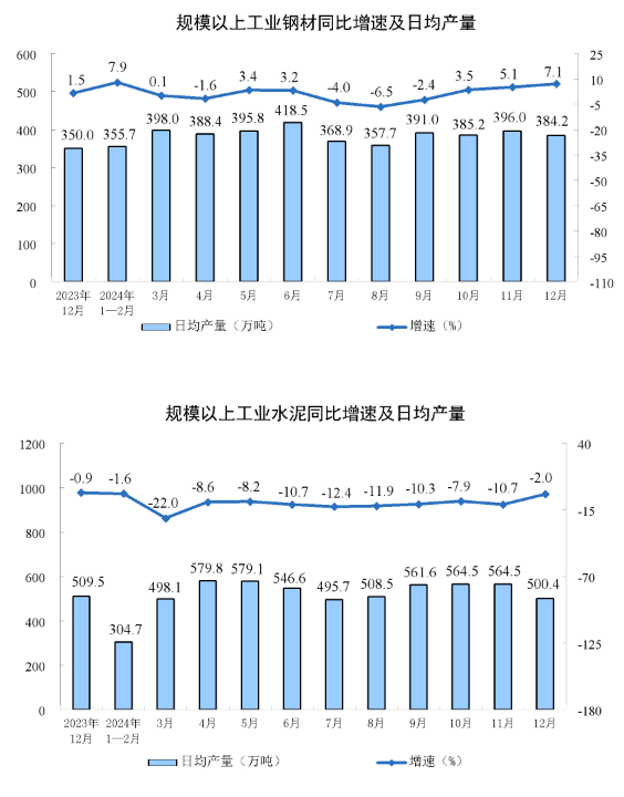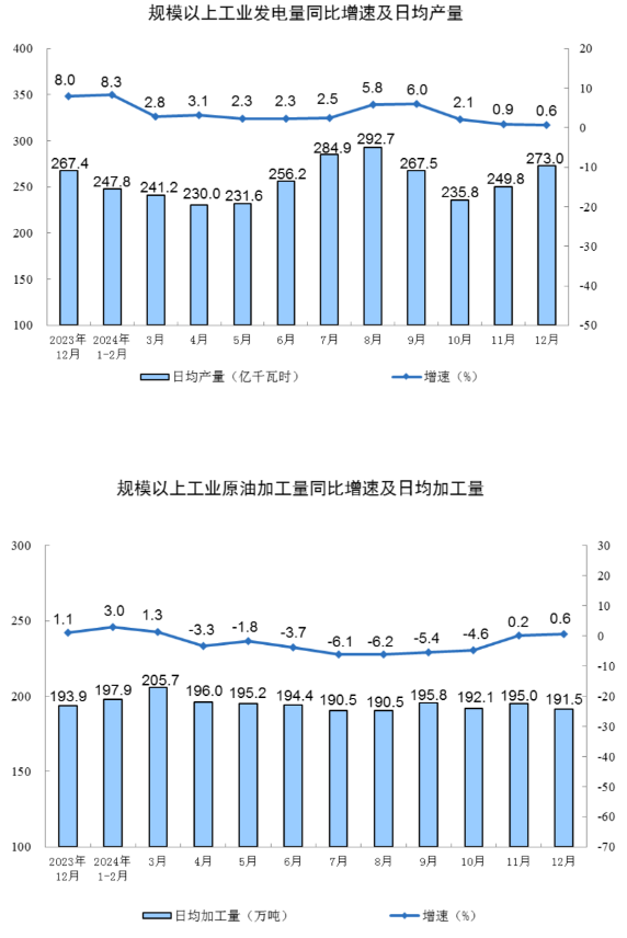 分产品看,12月份,规模以上工业619种产品中有396种产品产量同比增长。其中,钢材11910万吨,同比增长7.1%;水泥15512万吨,下降2.0%;十种有色金属690万吨,增长3.2%;乙烯312万吨,增长3.8%;汽车349.9 万辆,增长15.2%,其中新能源汽车164.7 万辆,增长43.2%;发电量8462亿千瓦时,增长0.6%;原油加工量5935万吨,增长0.6%。