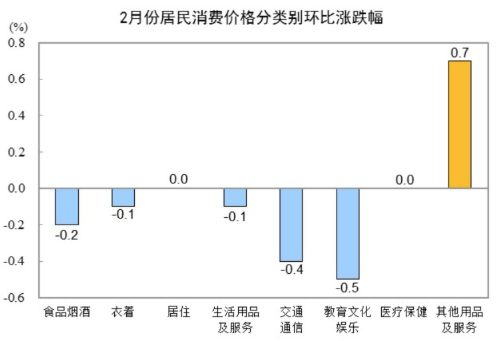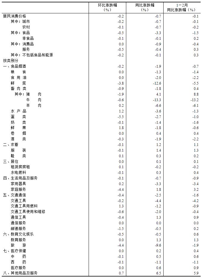 2月份,全国居民消费价格环比下降0.2%。其中,城市下降0.2%,农村下降0.1%;食品价格下降0.5%,非食品价格下降0.1%;消费品价格持平,服务价格下降0.5%。