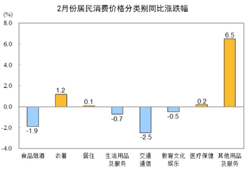 2月份,食品烟酒类价格同比下降1.9%,影响CPI(居民消费价格指数)下降约0.54个百分点。食品中,鲜菜价格下降12.6%,影响CPI下降约0.31个百分点;水产品价格下降3.6%,影响CPI下降约0.07个百分点;蛋类价格下降2.7%,影响CPI下降约0.02个百分点;畜肉类价格下降1.8%,影响CPI下降约0.05个百分点,其中猪肉价格上涨4.1%,影响CPI上涨约0.05个百分点;鲜果价格下降1.8%,影响CPI下降约0.04个百分点;粮食价格下降1.3%,影响CPI下降约0.02个百分点。