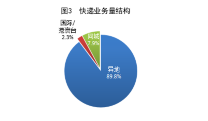 1—2月,同城、异地、国际/港澳台快递业务量分别占全部快递业务量的7.9%、89.8%和2.3%。与去年同期相比,同城快递业务量的比重下降1.5个百分点,异地快递业务量的比重上升1.5个百分点,国际/港澳台业务量的比重基本保持一致。