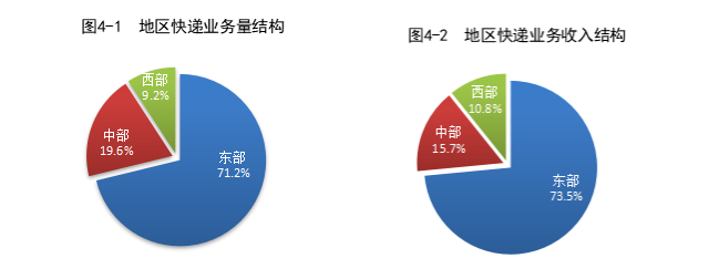 1—2月,东、中、西部地区快递业务量比重分别为71.2%、19.6%和9.2%,业务收入比重分别为73.5%、15.7%和10.8%。与去年同期相比,东部地区快递业务量比重下降1.7个百分点,快递业务收入比重下降0.8个百分点;中部地区快递业务量比重上升1.1个百分点,快递业务收入比重上升0.5个百分点;西部地区快递业务量比重上升0.6个百分点,快递业务收入比重上升0.3个百分点。